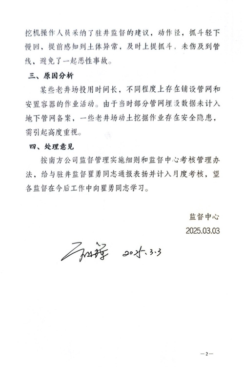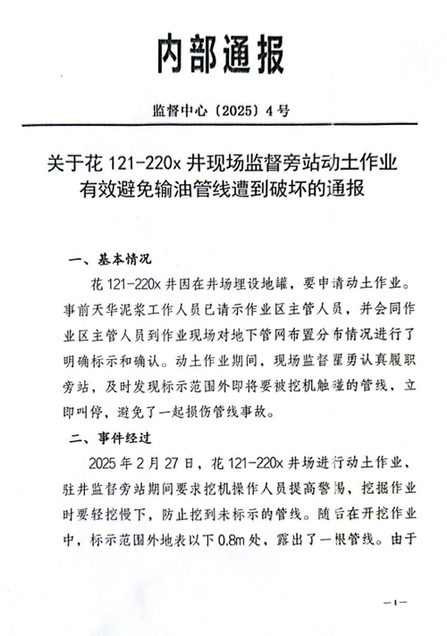 关于花121-220x井现场监督旁站动土作业有效避免输油管线遭到破坏的通报