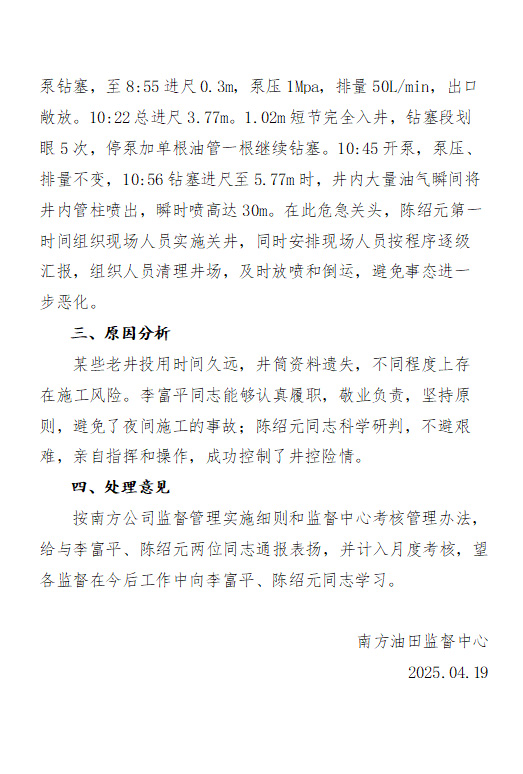 关于金凤6X井现场监督认真履职的表扬通报