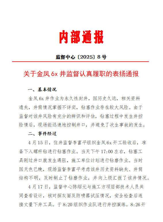 关于金凤6X井现场监督认真履职的表扬通报
